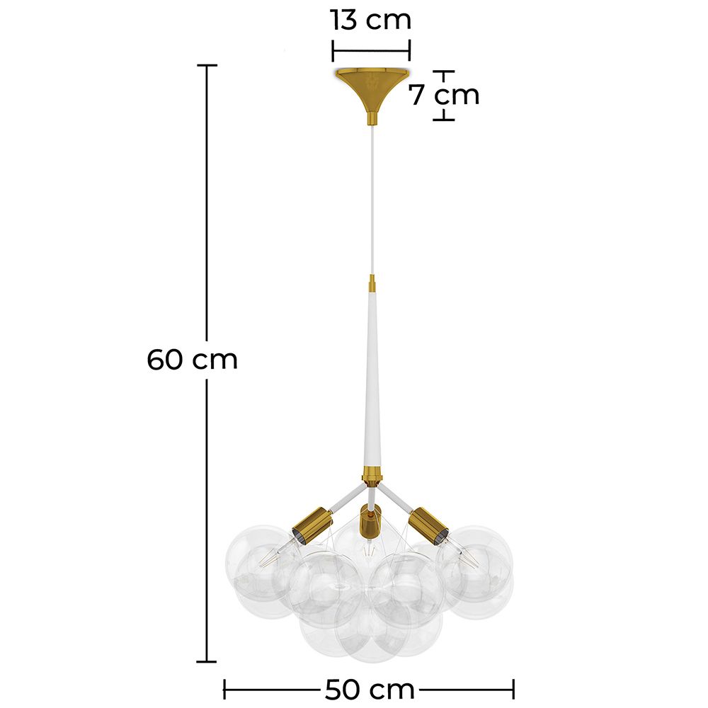 Ta lampa wisząca to wyróżniający się element. Jest to żyrandol z dziewięcioma szklanymi kulami i trzema żarówkami. Daj swojemu pokojowi centralną oprawę oświetleniową, która oświetli wnętrze nawet wtedy, gdy światła są wyłączone.